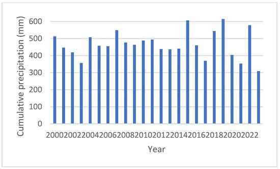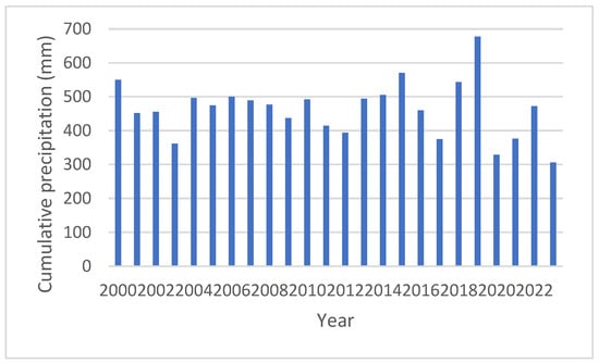 Cumulative precipitation (mm) in the Ajos area during the period 2000–2023.