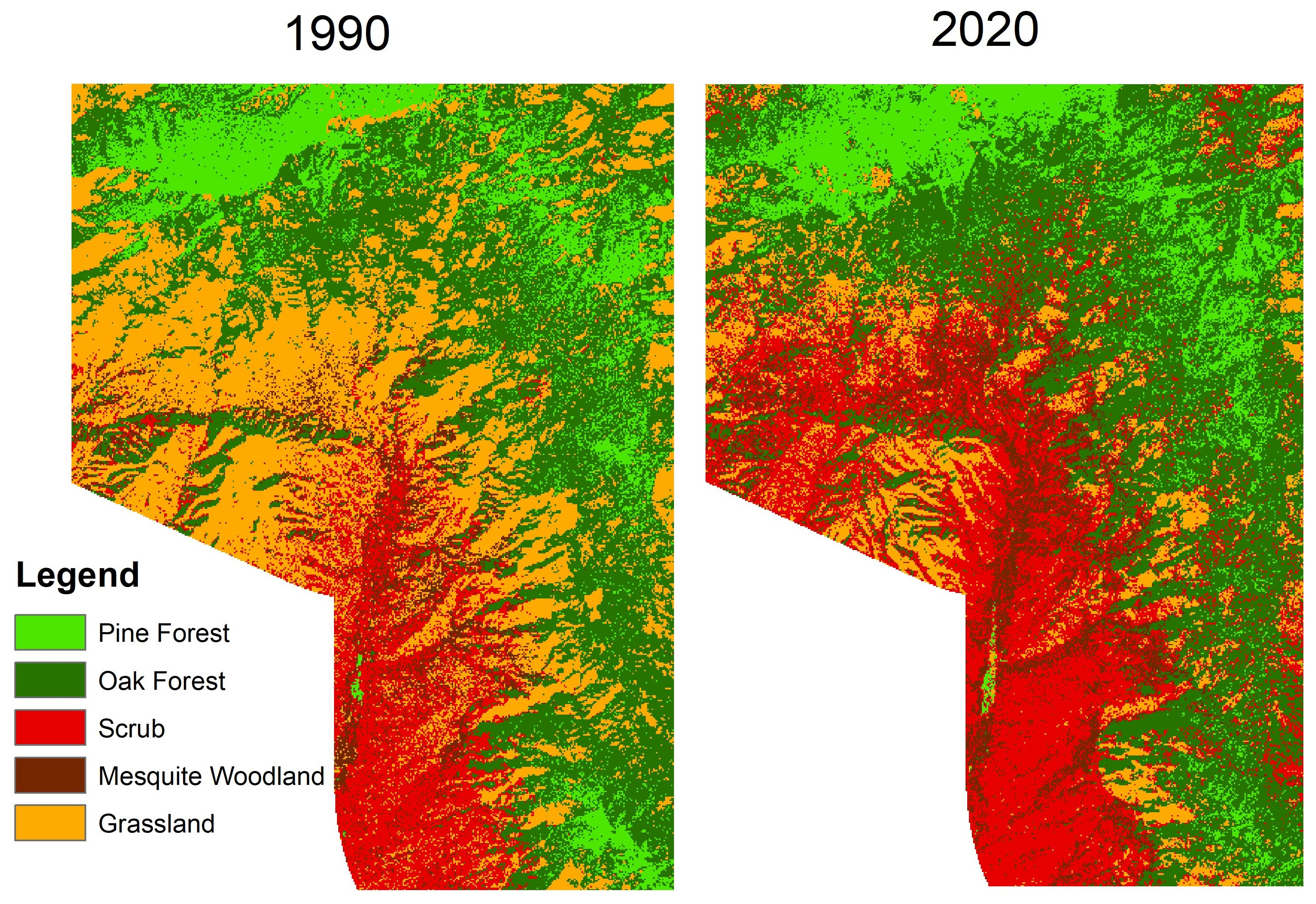 Land cover maps were generated for the years 1990, 2003, and 2020 for the Los Ajos fraction (