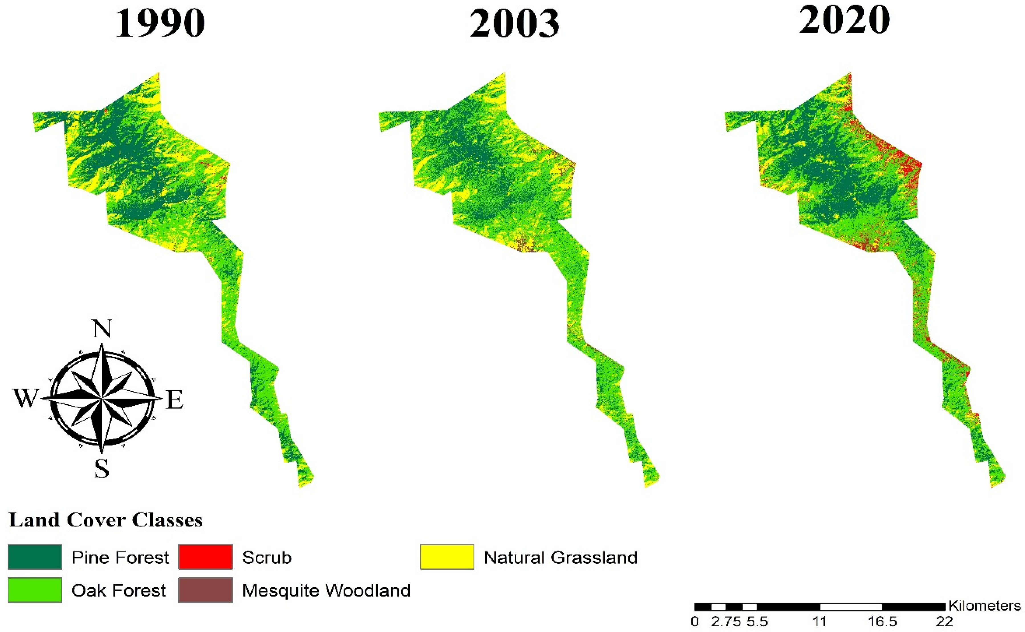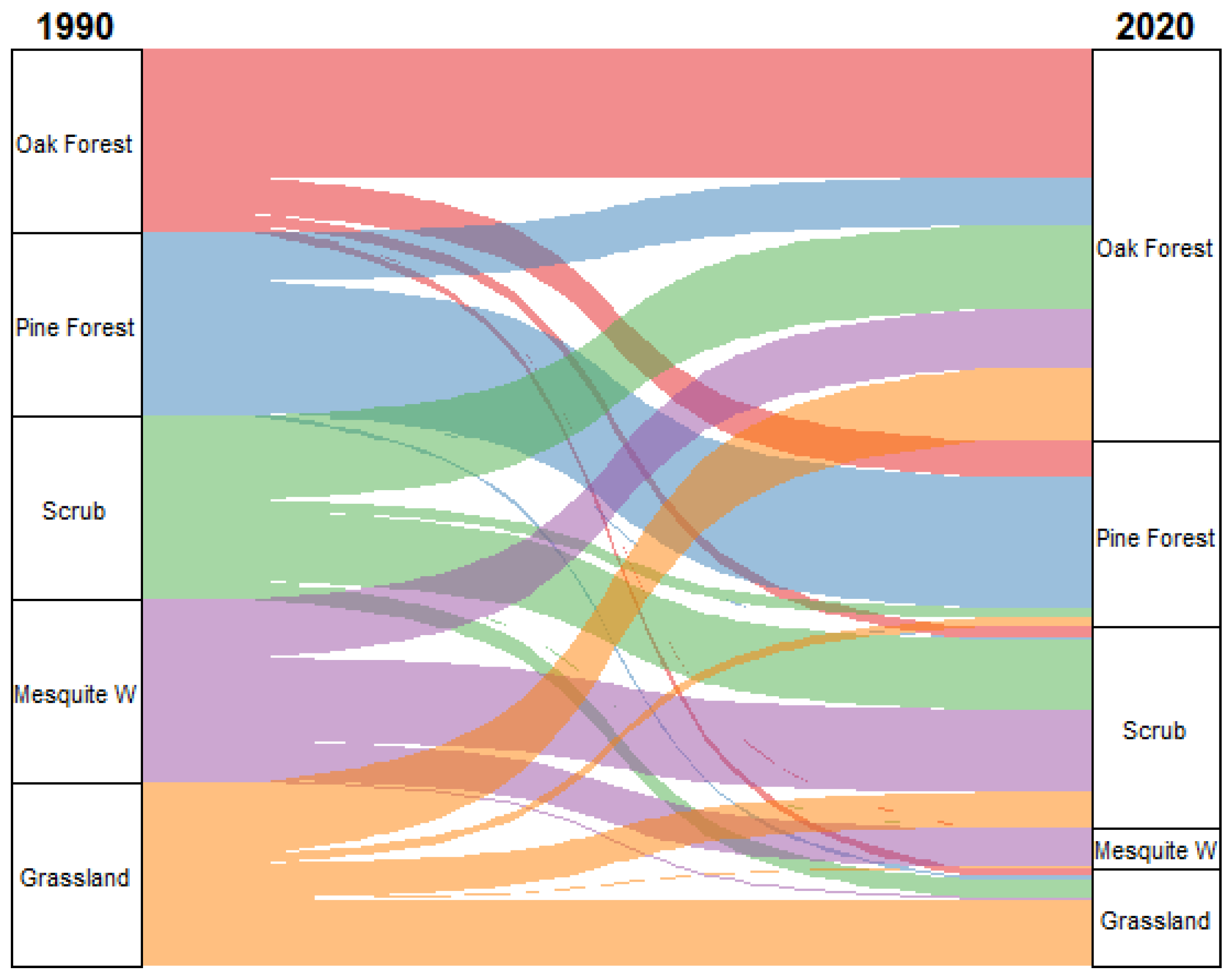 The results of this study indicate that between 1990 and 2020, the Los Ajos sector experienced a reduction of 81.41 hectares of pine forest, decreasing from 7033.14 ha in 1990 to 6947.73 ha in 2020. This change represents a loss of −1.214% relative to the original extent of this land cover type. In contrast, oak forest showed a notable expansion, increasing by 960.57 ha over the same period, from 8702.46 ha to 9663.03 ha, equivalent to an 11.03% increase from its initial area. Scrub exhibited the most dramatic transformation, expanding by 1322.64 ha, from just 101.34 ha in 1990 to 1423.98 ha in 2020, corresponding to a 1305.151% increase. Similarly, mesquite woodland experienced a substantial gain of 41.85 ha, growing from 101.34 ha to 1424.98 ha, which represents a 153.97% increase. Natural grassland, on the other hand, showed the most significant loss in spatial extent, with a reduction of 2239.65 ha, decreasing from 4261.41 ha in 1990 to only 2021.76 ha in 2020. This constitutes a −52.55% decline relative to its original area (