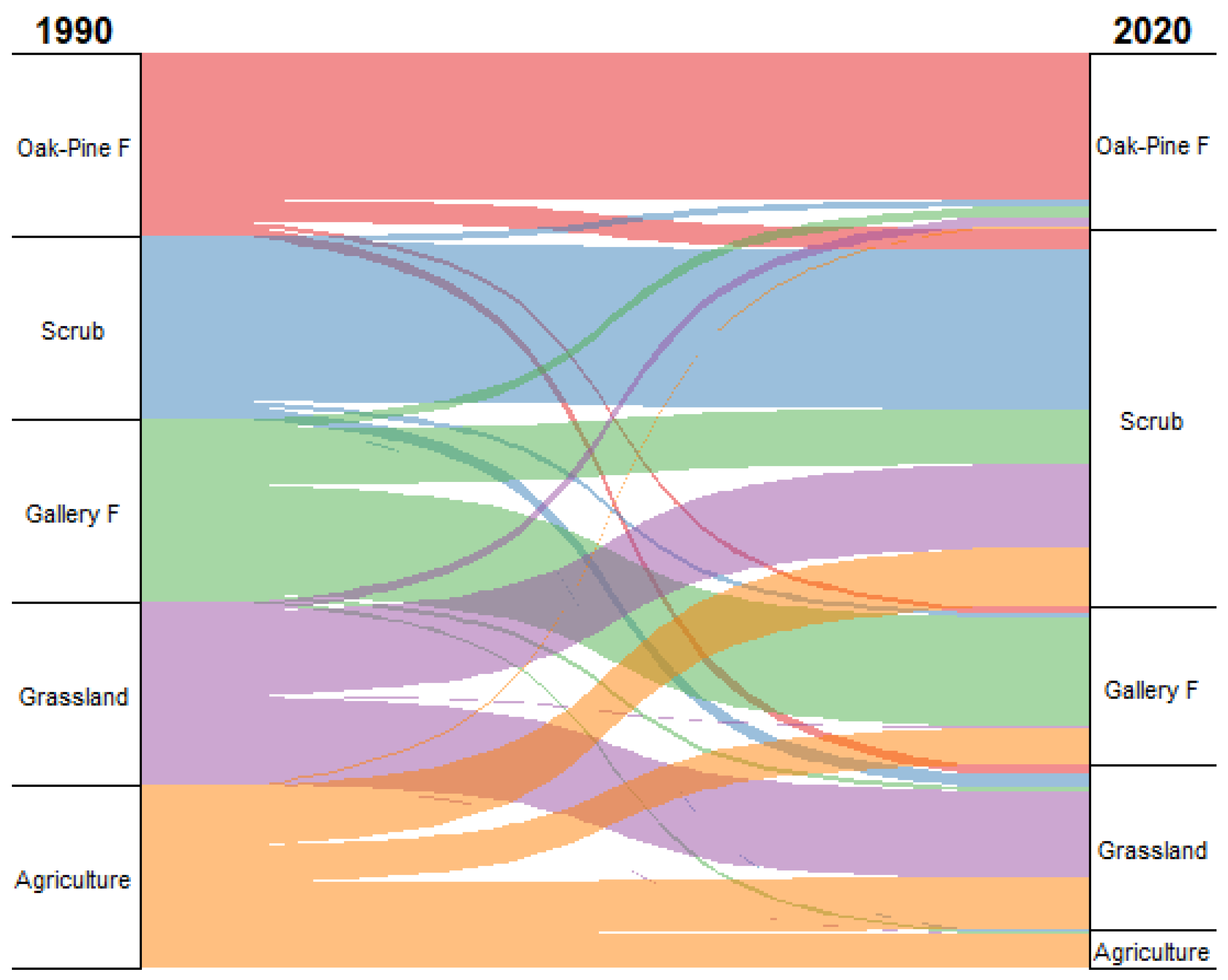 In the case of the La Madera sector, between 1990 and 2020, scrub remained the dominant land cover type, increasing by 1420.74 hectares, from 61,335.36 ha to 62,756.10 ha, representing a 2.316% expansion. Gallery forest also showed a significant increase, growing from 1603.89 ha to 3457.35 ha, which corresponds to a net gain of 1853.46 hectares or 115.56%. Oak-Pine Forest experienced a reduction of 852.84 hectares, decreasing from 19,638.81 ha to 18,785.97 ha, equivalent to a −4.343% loss in surface area. Grassland also declined, losing 1486.98 hectares, from 13,542.75 ha to 12,055.77 ha, corresponding to a −10.980% decrease, likely associated with the expansion of scrub. Finally, agricultural land showed a pronounced reduction of 934.38 hectares, dropping from 1374.30 ha to 439.92 ha, representing a −67.99% decrease from its original extent (