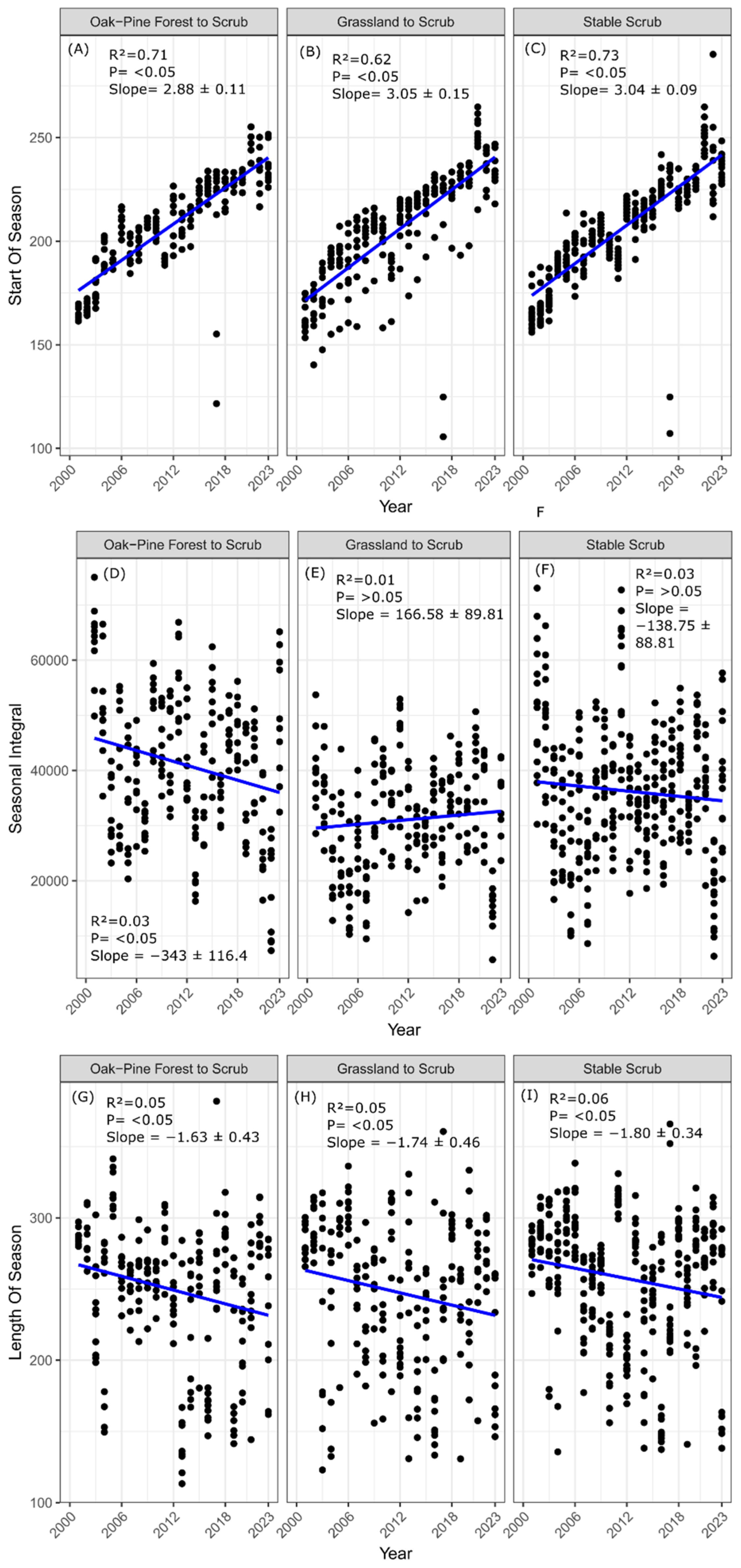 Figure 11C) also showed a delay in the start of the season, with an increase of 2.61 days per year, although with a lower explanatory power (R