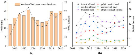 Dynamics of construction land supply (2009–2020). (a) Total supply area and number of land transactions, (b) composition by land subtype.