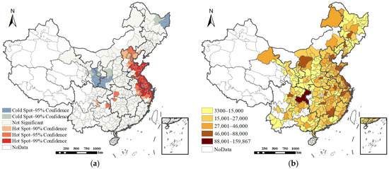 Cumulative area of construction land supply (ha) and hotspot distribution by city, 2009–2020. (a) Spatial distribution, (b) hotspot distribution.