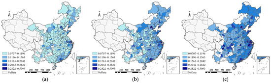 Spatial distribution of the combined level of high-quality urban development and its changes. (a) 2009, (b) 2015, (c) 2020.