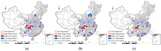 LISA chart of the combined level of high-quality urban development and its evolution. (a) 2009, (b) 2015, (c) 2020.