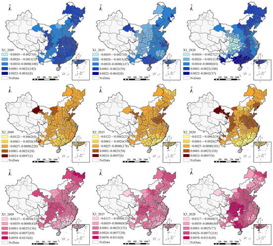 The impact of industrial land supply scale (X1) varies markedly across regions and over time. Spatially, from 2009 to 2020, some regions—such as southern China—have experienced a strengthening of positive effects, whereas others—such as western China—have seen an intensification of negative effects. These divergent trends are closely tied to regional differences in industrial development stages and their varying capacities to transform land inputs into high-quality urban growth. In more developed regions such as southern China, industrial upgrading and agglomeration economies enable additional land resources to be efficiently transformed into productive outputs, thereby reinforcing their positive contribution to HQUD. In contrast, in less-developed regions such as many parts of western China, the limited industrial base and less favorable location conditions may constrain the scale efficiency of land inputs, leading to inefficient land expansion and, consequently, a negative reinforcement of their impact over time.