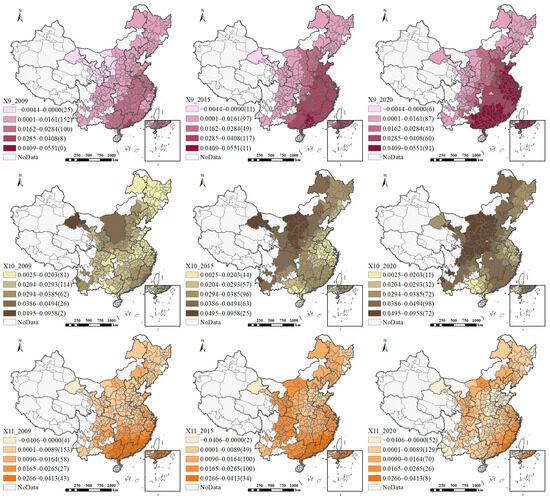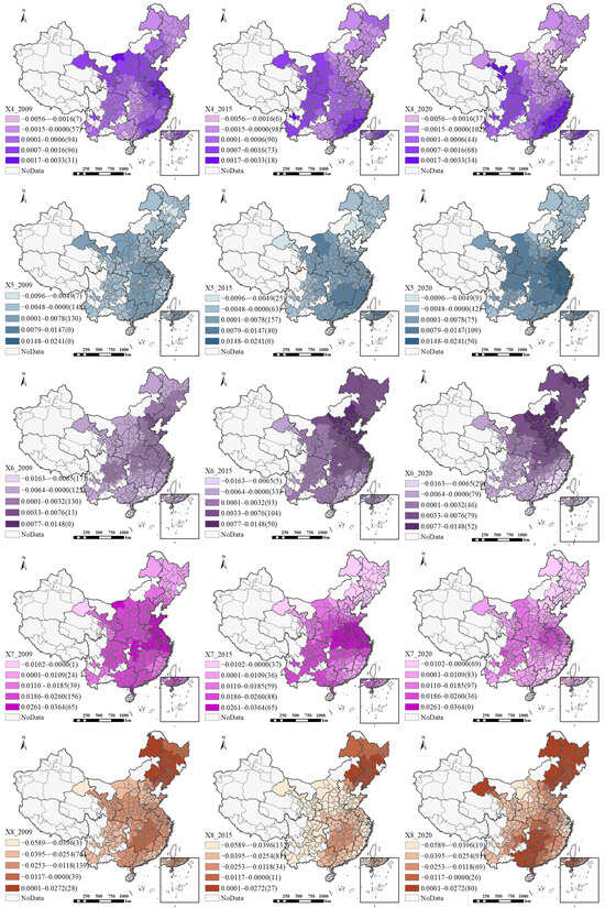 The investment intensity per capita (X7) predominantly exerts a positive influence on HQUD, although the magnitude of this effect has gradually diminished since 2014. In 2009, the positive effect was nearly universal across all cities. By 2015 and 2020, its spatial reach gradually narrowed, becoming primarily concentrated in the central and western regions. This shift is largely attributable to the fact that some cities have entered a phase of diminishing marginal returns to investment as their infrastructure has become increasingly mature, thereby reducing the effectiveness of capital investment alone in driving HQUD. In contrast, cities in the central and western regions remain in a critical stage of industrial upgrading and infrastructure development, where per capita investment intensity continues to exert a strong promoting effect.