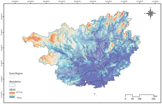 The Guangxi Zhuang Autonomous Region is located in southern China (104°28′–112°04′ E, 20°54′–26°24′ N) and acts as an ecogeographical transition zone between tropical and subtropical regions (Figure 1). The region contains diverse landforms, including typical karst landscapes, widely distributed hilly areas and coastal lowland plains, which create strong spatial contrasts in soil depth, water storage capacity and habitat conditions [29]. These geomorphological gradients lead to marked differences in vegetation structure and productivity, and thus shape the spatial heterogeneity of NPP and its sensitivity to hydrothermal variability [30].