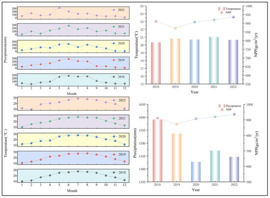 On a monthly scale (Figure 4), the five-year period displayed typical subtropical monsoon climate characteristics: there were low values during winter and spring (January–March), gradually increasing from late spring to early summer (April–July), reaching peaks during summer (June–August), and subsequently declining during autumn (August–October). Specifically, precipitation generally peaked between May and August, with May 2022 showing the highest precipitation at 325.36 mm. Temperature typically reached its highest points around July and August, with peak summer temperatures from 2020 to 2022 being slightly higher than those from 2018 to 2019.