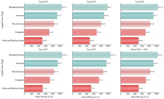 NPP change trends of major land-use types from 2018 to 2022. (Mean NPP refers to the average NPP of all valid pixels for a specific land-use type in a given year, expressed in units of gC/m2/yr).