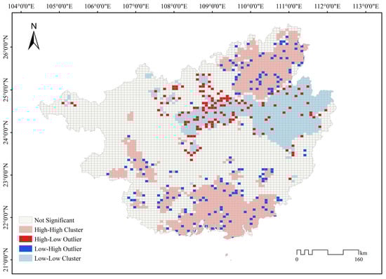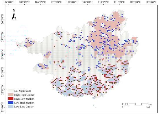 To further understand the spatial differentiation patterns of hydrothermal sensitivity coefficients in the study area, this study applied the Local Indicators of Spatial Association (LISA) method to identify the spatial clustering and outlier characteristics of precipitation and temperature sensitivity coefficients (Figure 10 and Figure 11). Additionally, a comprehensive spatial comparison of the two factors was conducted to reveal deeper spatial heterogeneity and driving mechanisms. The spatial distribution of sensitivity coefficients was classified into five categories: High–High Cluster (hotspot), Low–Low Cluster (coldspot), High–Low Outlier, Low–High Outlier, and Not Significant, which indicates locations where the NPP value differs markedly from that of the surrounding units. Based on the significance of the LISA statistics (p < 0.05), we mapped the LISA cluster types to reveal the spatial aggregation patterns of NPP and their differences among land-use types.