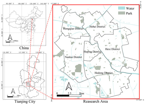 This study focuses on the six central districts of Tianjin, China—Heping (HP), Nankai (NK), Hedong (HD), Hexi (HX), Hebei (HB), and Hongqiao (HQ)—where population density, urban vitality, and demand for urban parks are most concentrated (Figure 1). First, we construct behavior-grounded visitation intensity (VI).