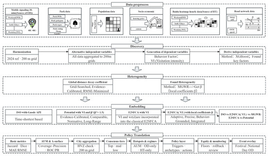 We adhere to a transparent workflow comprising discovery, heterogeneity analysis, and parameter embedding (Figure 2). First, we construct behavior-grounded visitation intensity (VI) and empirical park service boundaries from OD and HT data. Second, XGBoost and MGWR are used to identify and quantify spatially varying determinants of visitation. Third, these local effects are embedded into classical accessibility models (E2SFCA and potential) to obtain location-specific parameters. Finally, we benchmark calibrated and baseline models against empirical boundaries using geometric overlap, population-weighted errors, and area–use mismatch (AUM) and interpret the results for planning and operations.