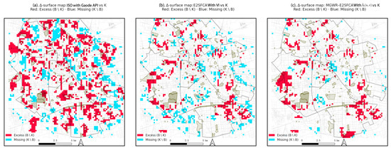 -surface maps for three representative methods. Red cells indicate excess (); blue cells indicate missing (). Panels show (a) ISO with Gaode API, (b) E2SFCA with , and (c) MGWR–E2SFCA with spatially varying coefficients. Park polygons and major roads provide spatial context.The grey-green area in the figure represents the area of each park.