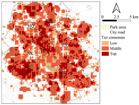 Citywide tier consensus across ISO, E2SFCA (with ), and MGWR–E2SFCA on the 200 m grid. Park areas and city roads provide spatial context; colors denote low, middle, and top consensus tiers, with warmer colors indicating stronger cross-model agreement. District labels (NK, HP, HB, HX, HD, and HQ) mark administrative context.