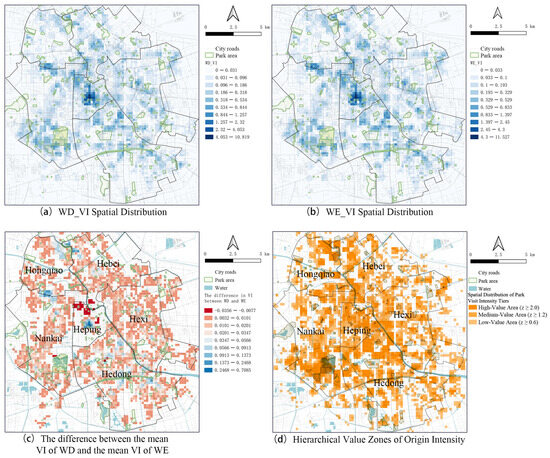 Based on the results in Figure 6c, observed visitation intensity (VI) is concentrated in the urban core and expands toward flagship parks on weekends. On weekdays, VI forms compact, path-dependent catchment areas around community parks, while weekends exhibit larger service footprints along high-centrality corridors—particularly notable near the Heping–Hexi interface. On weekends, VI is more concentrated in Heping District and near several city-level parks located in the southern part of Hebei District. Although VI in Heping District increases markedly on weekends, this may be influenced by its proximity to the railway station and the high density of tourist attractions in the area.