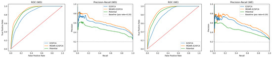 ROC for weekday visitation: three methods are evaluated: E2SFCA (blue), MGWR-E2SFCA (orange), and the Potential model (green). In the ROC plots, the red dashed diagonal represents the performance of a random classifier (AUC = 0.5).In the Precision-Recall plots, the gray dashed horizontal line indicates the baseline precision equal to the positive class prevalence.