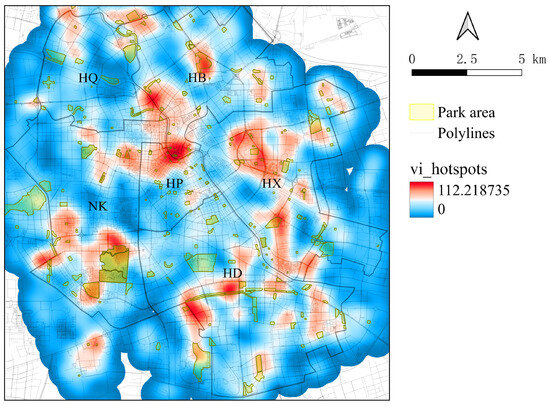 In contrast, weekday VI is more spatially dispersed (Figure 6c), suggesting that people tend to visit parks closer to their daily locations rather than traveling to larger or more distant ones. Nonetheless, Heping District still records the highest number of park visits on weekdays, which is closely associated with its high population density and concentration of commercial centers.
