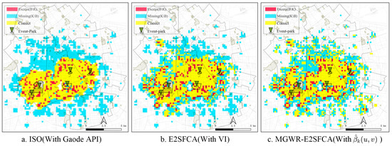 Holiday-day (National Day) validation on the 200 m grid. Colors denote excess (, red), missing (, cyan), and correct (, yellow). Panels show (a) ISO (Gaode API), (b) E2SFCA (with ), and (c) MGWR–E2SFCA (with local coefficients). Thresholds are held fixed across methods (baseline Jaccard fit) to ensure comparability.