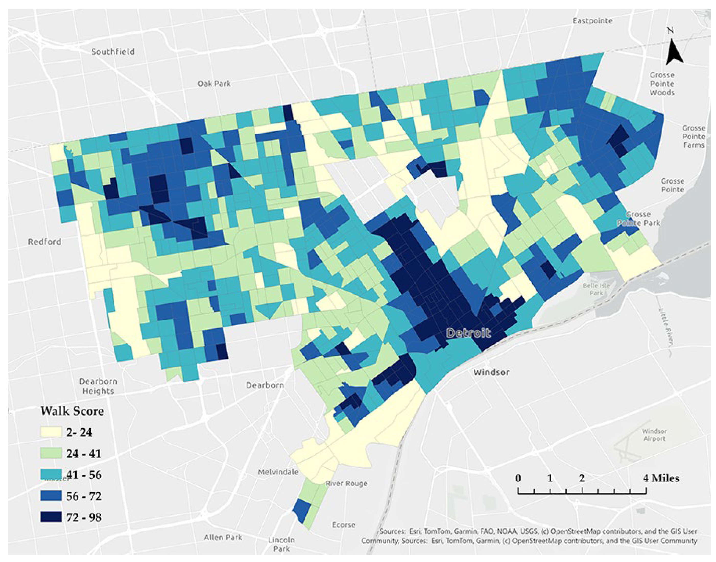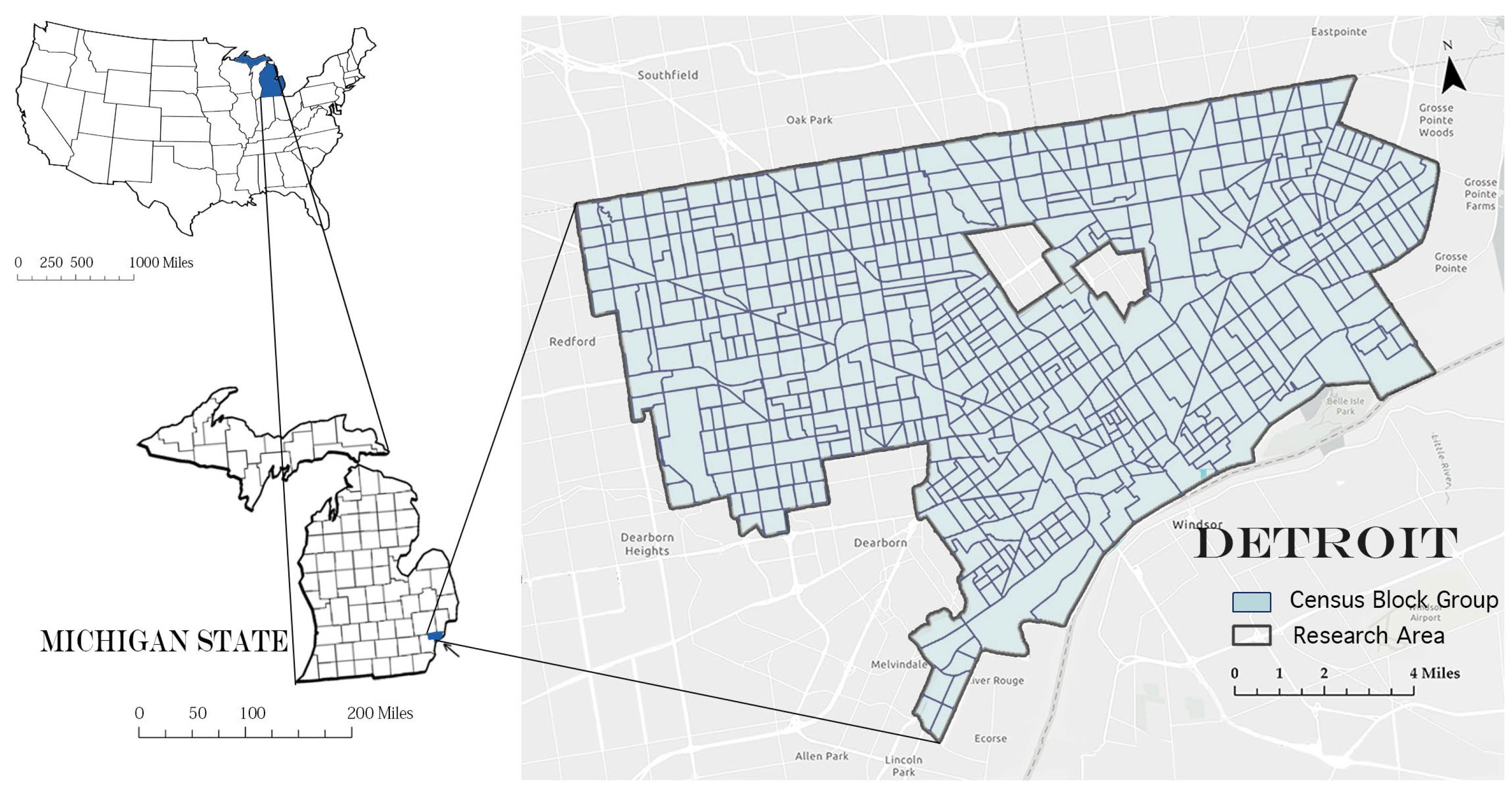 - Dean, C.A.; Shrestha, J.; Siddiqui, U. Exploring the impact of Detroit’s neighborhood characteristics on residents’ mental well-being. Front. Environ. Health 2024, 3, 1449268. [Google Scholar] [CrossRef]