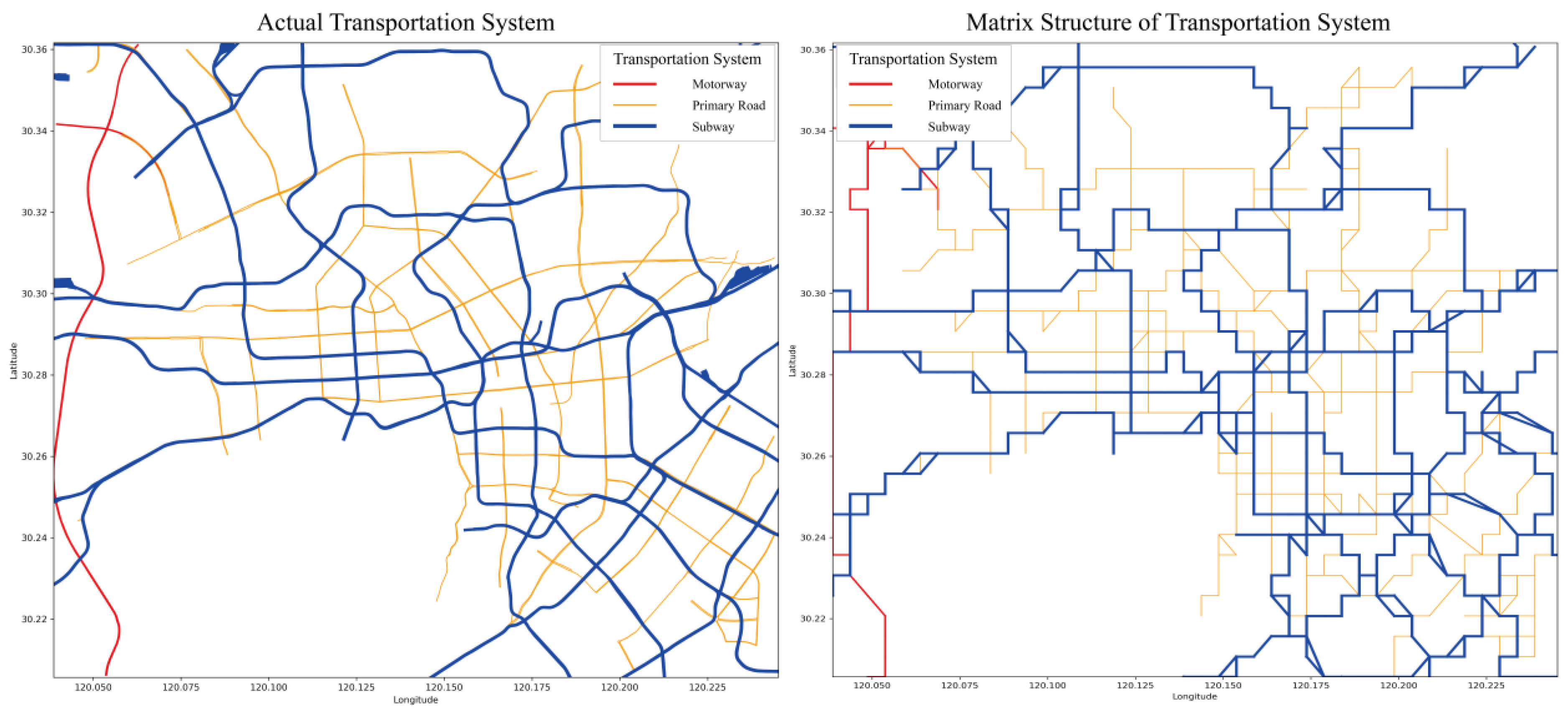 - Path Emissions: Path emissions are calculated based on transportation activities between different cells. We use a discrete choice model to determine the probabilities Pkm of using different modes of transportation m for traveling between cells k and l. The emissions for each transport mode m are given by βm, and the distance between cells k and l is denoted as dkl, as shown in Equation (6):