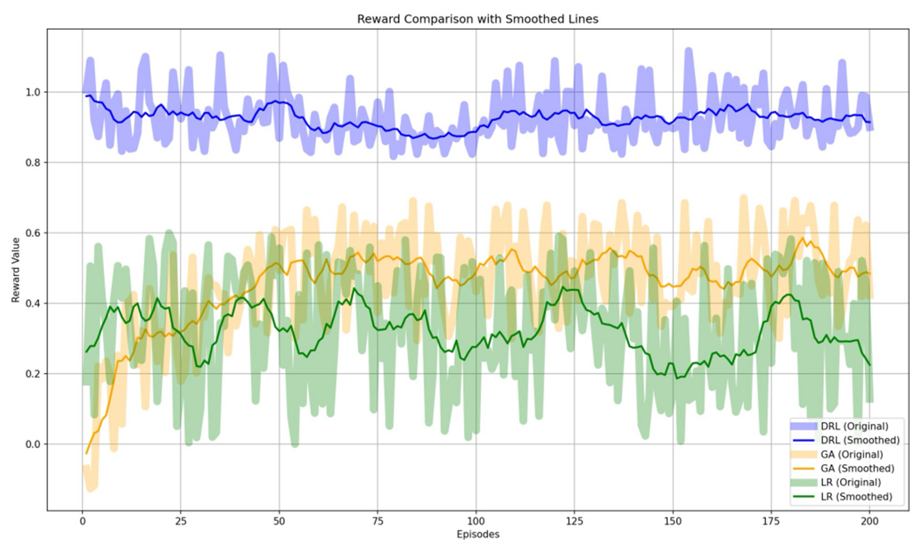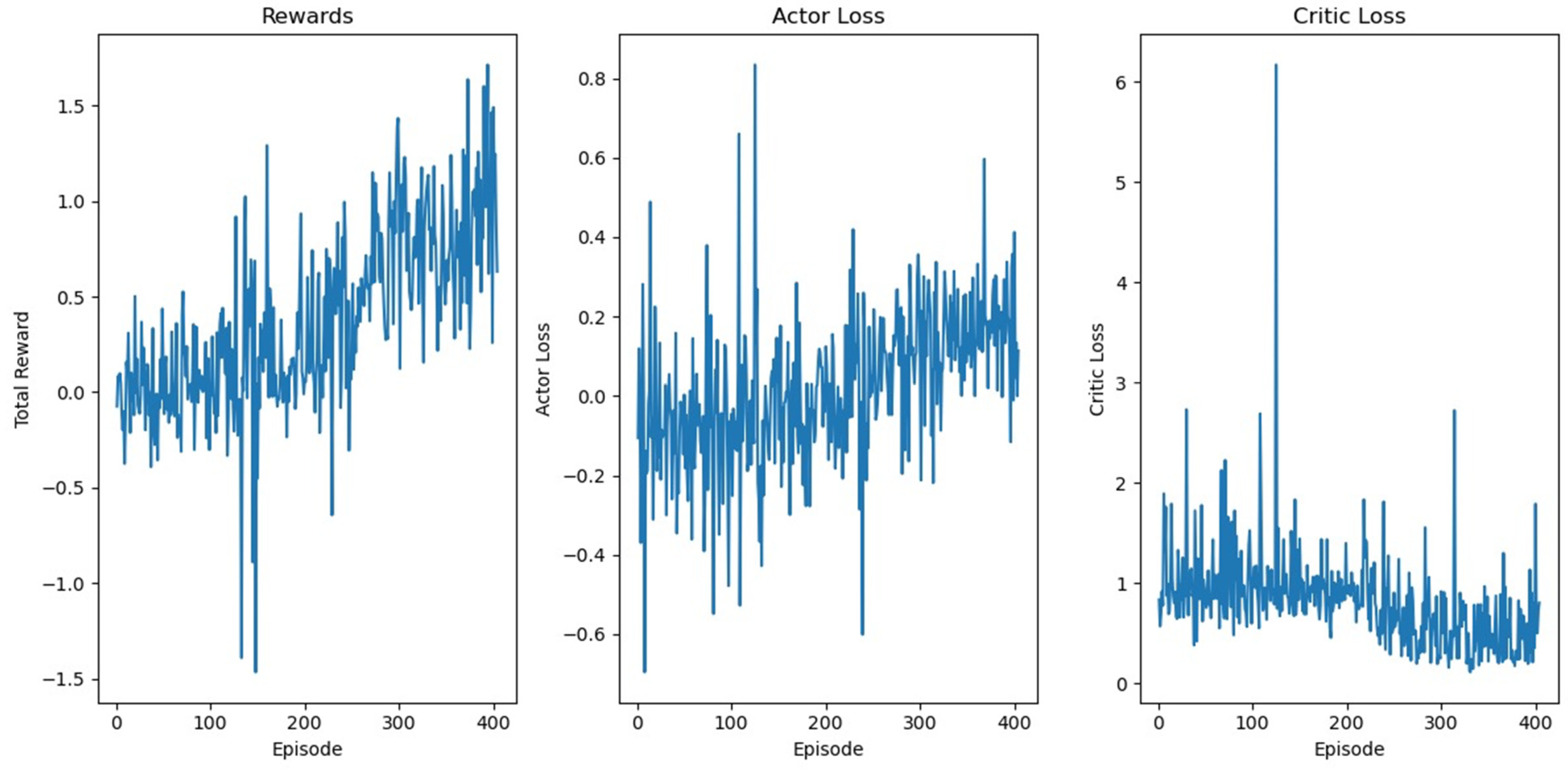 - Actor Loss: The actor loss, which quantifies the policy network’s error in selecting actions, also shows considerable variability but generally trends towards stabilization. Despite occasional spikes due to the stochastic nature of policy updates and the exploration-exploitation trade-off, the overall trend is a decrease in actor loss, signifying that the policy network is learning to make more accurate action selections. The stabilization of actor loss as training advances reflects the network’s improved ability to refine its policy.