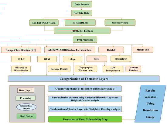The methodology applied in this study follows the structured sequence in Figure 2 to assess urban flood susceptibility in the study area. RS data from Landsat’s 5, 7 and 8 and DEM from STRM (2004, 2014, 2024) were processed for LULC classification using the RF model. Data preprocessing was performed to improve the quality and ensure the reliability of the results. Various thematic layers, including slope, distance to water bodies, and topographic wetness index, were integrated with secondary data such as population density, rainfall, and MODIS LST. Temporal trends were analyzed using the Sen’s slope method, while rainfall distribution was estimated using IDW interpolation. All factors were then normalized and combined using the AHP and weighted overlay analysis. This methodology generated a comprehensive flood vulnerability map by quantifying the influence of each factor, integrating both physical and socio-economic variables, and offering insights for adaptive flood risk management.