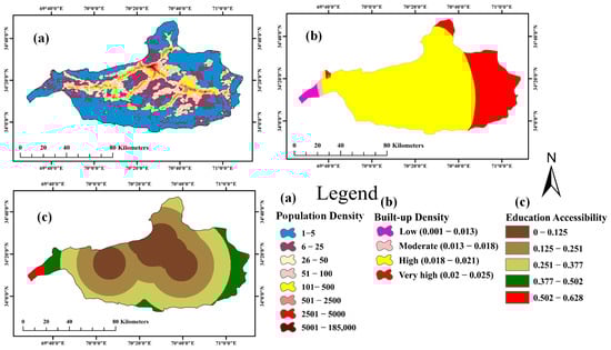 Socioeconomic indicators of flood susceptibility of the study area: (a) population density, (b) built-up density, and (c) education accessibility.
