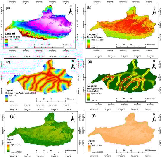 Geoenvironmental and topographic distributions of Nangarhar (a) elevation, (b) slope, (c) distance from water bodies, (d) DD, (e) TWI, and (f) SPI.