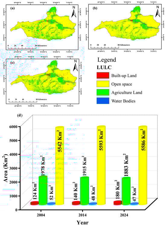 LULC Maps of Nangarhar: (a) 2004, (b) 2014, (c) 2024, and (d) area distribution of LULC categories across these years.