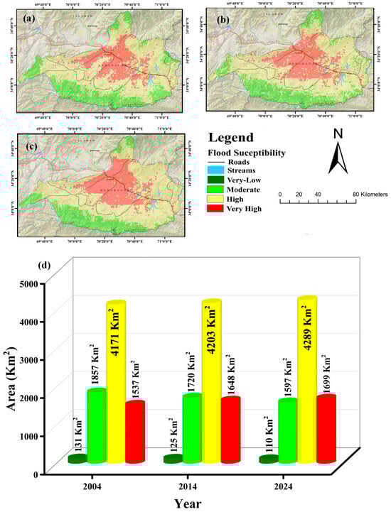 Flood susceptibility map of Nangarhar: (a) 2004, (b) 2014, (c) 2024, and (d) area distribution of Flood susceptibility map categories across these years.