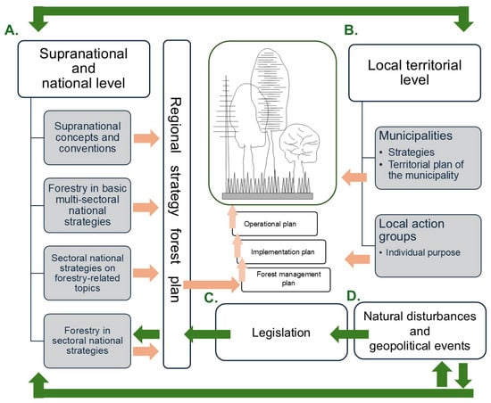 Regional forest strategy plans, as special strategic documents, are used by forest owners and municipal representatives, and they serve as a basis. When we understand this as a tool of forestry policy, it should be implemented in line with subsidiarity, i.e., decision-making and responsibility should take place at the lowest possible administrative level and as close as possible to citizens. According to Yamada [31], regional forest planning can enable participatory planning involving various stakeholders and decision-makers, and participatory models can serve as tools to support such an approach. The main objectives of these methods are to integrate knowledge and harmonize stakeholder views. Subsidiarity should then be ensured by the territorial plan itself, which is usually publicly presented during legislative processes and subsequently validated. Subsidiarity is perceived here as the opposite of centralism and should support decentralization and self-government. Forest management plans and territorial plans should ensure integration. They are built on specific local knowledge (especially regarding the characteristics and specifics of natural conditions, social requirements, e.g., protection, nature, ownership requirements, environmental limits, and resources: economic, social, technical, etc.). At the local level, the most hierarchically important documents are the forest management plan and the municipality’s territorial plan.