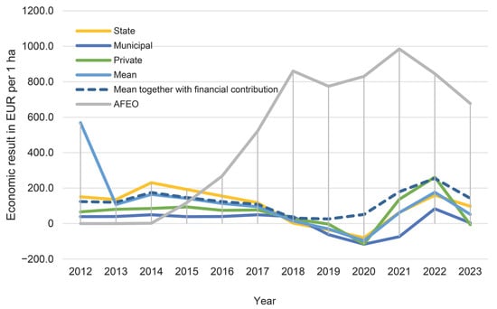 In response to RQ2: “How does this specifically affect the forest bioeconomy and what are its impacts?”, it is possible to clarify how the presence or absence of forestry in strategic documents is linked to bioeconomic outcomes, including access to funding, policy support, and implementation efficiency. Using the example of a forestry company, the economic results comparison shows that state forests consistently achieve the best results. This can be understood as the result of the action of individual strategies and documents, especially at the national level (link to state forest owner). The economic contribution of the state through subsidies is particularly significant for municipal forests. For a private forest owner with a sufficiently large forest cover, this may positively affect bioeconomic outcomes; even so, their economic results are significantly better than those of other types of owners, regardless of the presence of a strategic document to support forest bioeconomy. These strategic documents supporting bioeconomic outcomes for small-scale private forest owners can be existential. This should be the subject of further research.