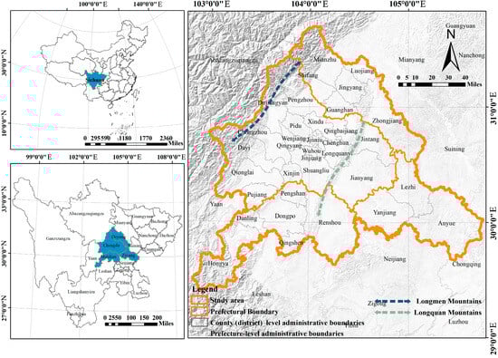 The Chengdu Metropolitan Area (102°49′–105°27′ E, 29°15′–31°42′ N), located in the western Sichuan Basin, features a topography characterised by “one-fifth mountainous terrain, one-fourth flat plains, and one-fourth hilly areas.” The study area averages 1102.84 mm of precipitation annually (Figure 1). The region falls within the subtropical humid monsoon climate zone and encompasses four distinct administrative units: Chengdu City, Deyang City, Meishan City, and Ziyang City. As set out in the Chengdu Metropolitan Area Territorial Spatial Plan (2021–2035) [25], the region’s total planned area is 33,100 square kilometres, with the long-term planning target year set for 2035.