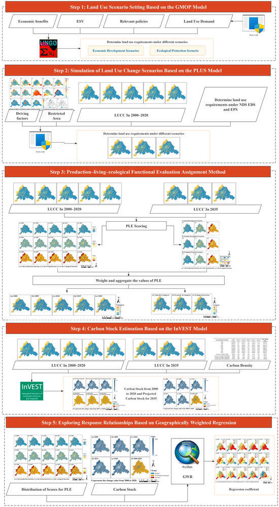 This study uses a comprehensive research framework that integrates multi-objective optimization, spatial simulation, carbon sink assessment, and mechanism analysis. This study discusses the coupling mechanism between the structural transformation of the PLE functions and changes in carbon stock in the study area from 2000 to 2020. This is accomplished through the Coupling-Carbon Sink Assessment-Mechanism Analysis framework. The model forecasts the development of PLE functions and changes in carbon stocks by 2035, serving as a decision-support tool for national land use planning. It incorporates multi-scenario foresight, spatially explicit assessment, and mechanism analysis capabilities. The next key findings are presented: