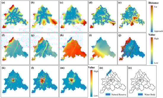 Figure 3. The driving factors and restricted areas. (a) Distance to highway; (b) Distance to railway; (c) Distance to primary road; (d) Distance to Secondary road; (e) Distance to third-level road; (f) Elevation; (g) Slope; (h) Temperature; (i) Precipitation; (j) Soil; (k) Population density; (l) Nighttime lighting; (m) GDP; (n) Nature Reserve; (o) Water body; ((am) is the Driving factors, (n,o) is the limiting factors).