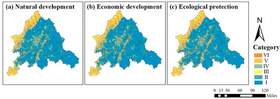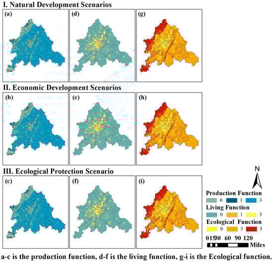 Multi-scenario simulations suggest that, in the natural scenario, production and ecological functions will decline by 2035, with an increase in Zone 0 of 429.64 km2 and 835.38 km2, respectively. In the current economic context, living functions are expected to experience notable changes, characterized by a reduction of 730.91 km2 in Zone 0 and an increase of 539.69 km2 in Zone 1. Simultaneously, ecological functions are expected to diminish, accompanied by an increase of 730.91 km2 in Zone 0. The ecological scenario indicates an improvement in ecological quality, accompanied by an increase in Zone 5 by 454.74 km2. Production capacity is limited, leading to an expansion of 629.05 km2 in Zone 0. Analysis of spatial distribution patterns across scenarios indicates a consistent configuration: living functions expand contiguously, ecological functions extend along the “Two Mountains” axis, and functional conversions occur regularly.