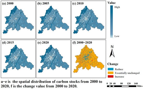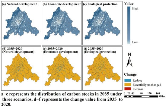 Between 2000 and 2020, carbon stocks decreased by 1199.63 × 104 t, indicating a decline of 4.51%. This was mainly due to a reduction of 1250.34 × 104 t in Class I areas, which displayed a spatial distribution characterized by “lower values in the center and higher values in the west.” The urban carbon sink has been diminished, resulting in the fragmentation of high-value areas. By 2035, the reduction in carbon stocks continued, with the EDS showing the greatest decline (−613.18 × 104 t, −2.47%) and the EPS reflecting the smallest decrease (−418.38 × 104 t, −1.68%). The spatial distribution of the pattern, characterized by a gradient from lower concentrations at the center to higher concentrations at the periphery, remains evident. In the context of ecological protection, the analysis shows that carbon stocks exhibit localized expansion in the “Two Mountains” and southern regions, thereby providing improved support for carbon sink functions and system stability.
