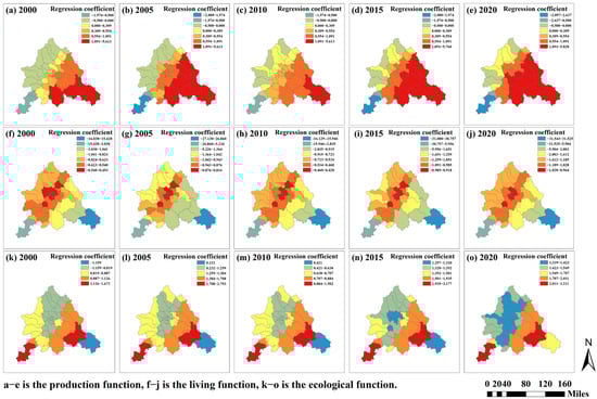 The influence of PLE functions on carbon stocks demonstrates intricate spatiotemporal variability. The spatial distribution of carbon sinks, influenced by natural geographical conditions, demonstrates a pattern of “higher in the west, lower in the east.” Human activities, including urbanization and ecological policies, significantly influence the dynamic evolution of these sinks. The findings demonstrate that improved production functions can increase carbon sinks, with the percentage of areas showing a positive impact rising from 58.60% to 81.15%. The regression coefficients for the living functions were primarily negative, between −1.16 and −2.30, whereas those for the ecological functions were mainly positive, ranging from 0.87 to 1.65. The spatial distribution of the production functions is characterized by a pattern of positivity in the southeast and negativity in the northwest, while the negative effects of the living functions show concentric expansion and an eastward shift. The beneficial impacts of the ecological functions are concentrated in the central and western regions.