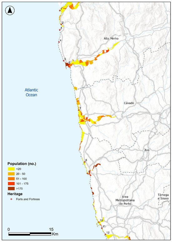 Coastal population distribution and location of forts and fortresses along the northwestern Portuguese coast. Source: Own elaboration, based on INE (2022) [22].