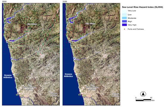 In the second phase, all architectural structures were georeferenced using GPS, enabling the creation of a spatially and visually accessible database integrating geographic and observational data. Google Earth imagery was employed to complement field observations, with aerial images collected in 2020 and 2025 to detect and illustrate macroscale environmental and morphological changes over time. In a second phase, this study assessed the vulnerability of coastal fortifications to coastal flooding and coastline retreat resulting from sea-level rise. The methodology combined scientific data on climate change projections with the geographic location and constructive typology of each fortification, following a semi-quantitative approach inspired by previous frameworks such as the risk assessment in the fortifications of the Canary Islands [27] and Historic Environment Scotland (HES) scorecard and the Forino et al. [28] model for archeological heritage in Australia. The study then presents a quantitative analysis of the Sea Level Rise Hazard Index (SLRHI) and the Coastal Vulnerability Index (CVI).