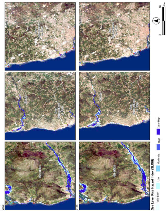 Compared with the previous fieldwork analysis, these mapped results reveal a spatially coherent pattern. The same coastal stretches identified as subject to flooding, humidity, and saltwater influence are also among the most sensitive to sea-level rise and shoreline retreat. Thus, the mapping reinforces the notion that northern open-ocean sectors and estuarine transitions are the primary zones of future inundation and morphological change under projected sea-level rise scenarios.