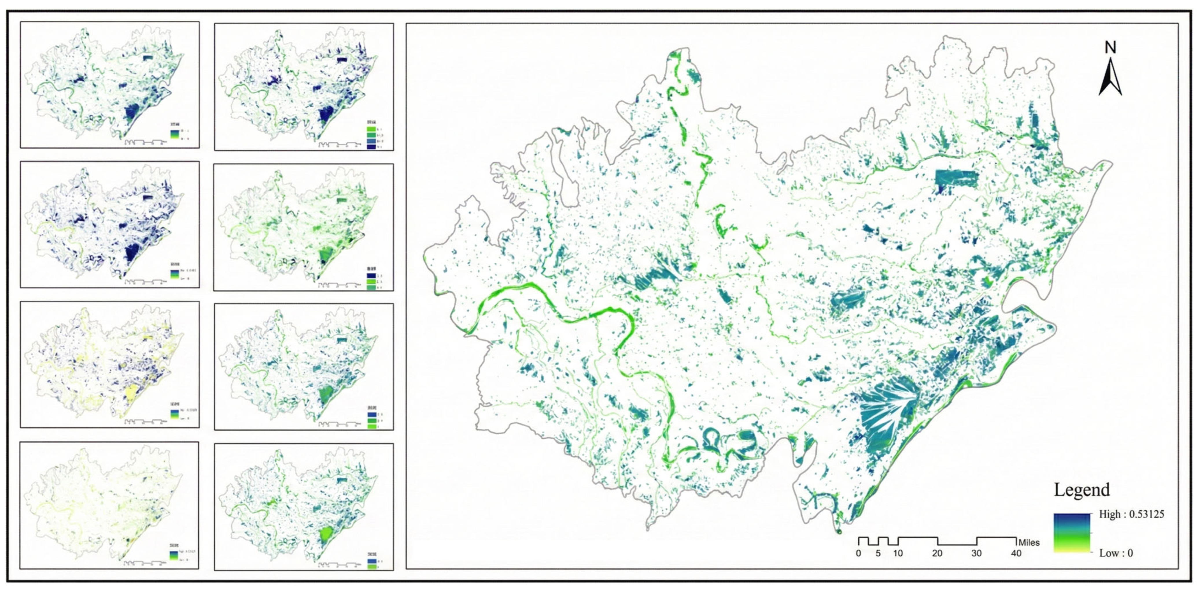 The CNLUCC dataset was reclassified into the LULC categories required by the InVEST model. Major wetland types, such as rivers, lakes, reservoirs/ponds, and tidal flats/marshes, were extracted to create a wetland mask. A key–value mapping table linking each LULC class to its corresponding model parameters was developed according to the InVEST guidelines.