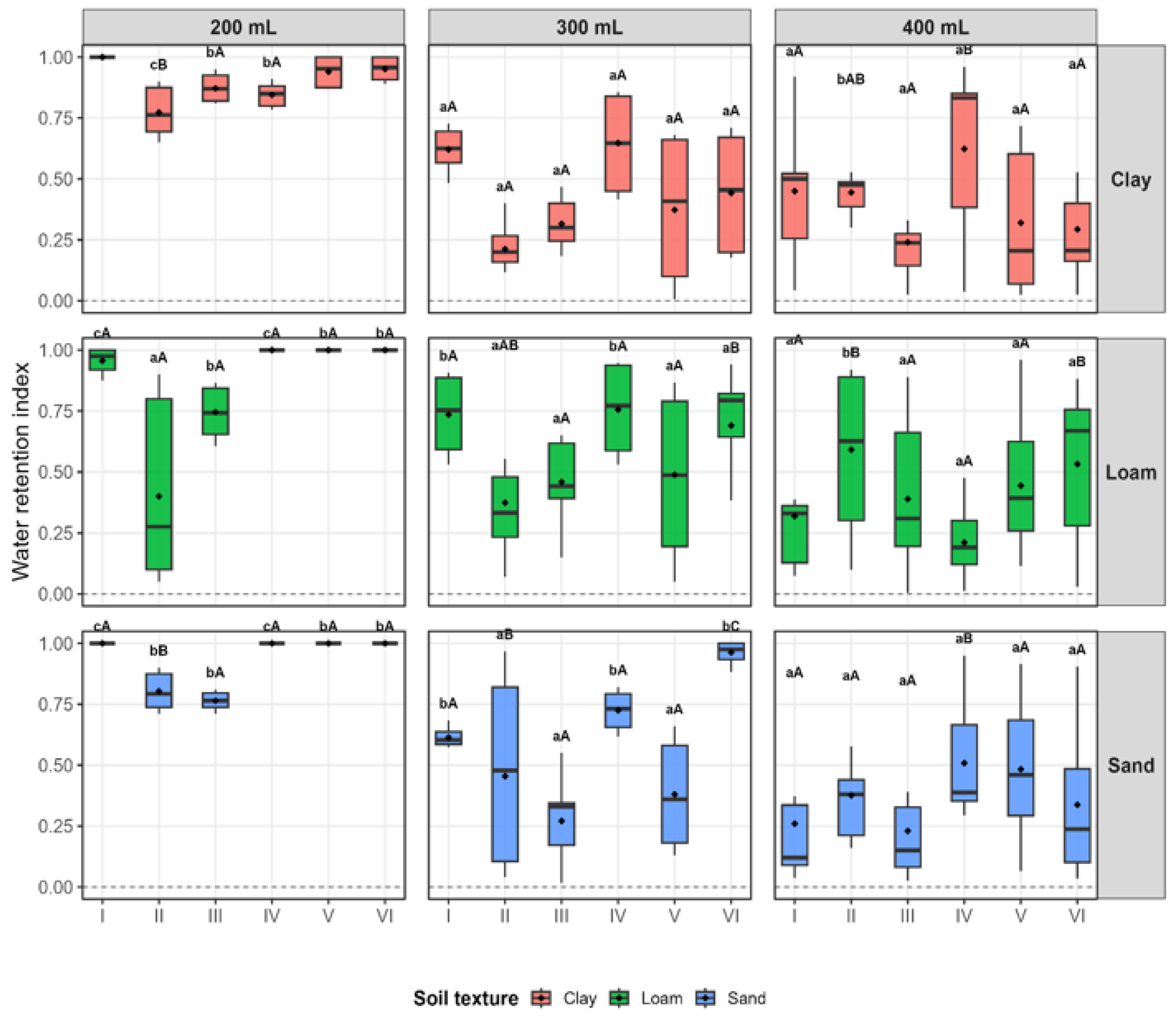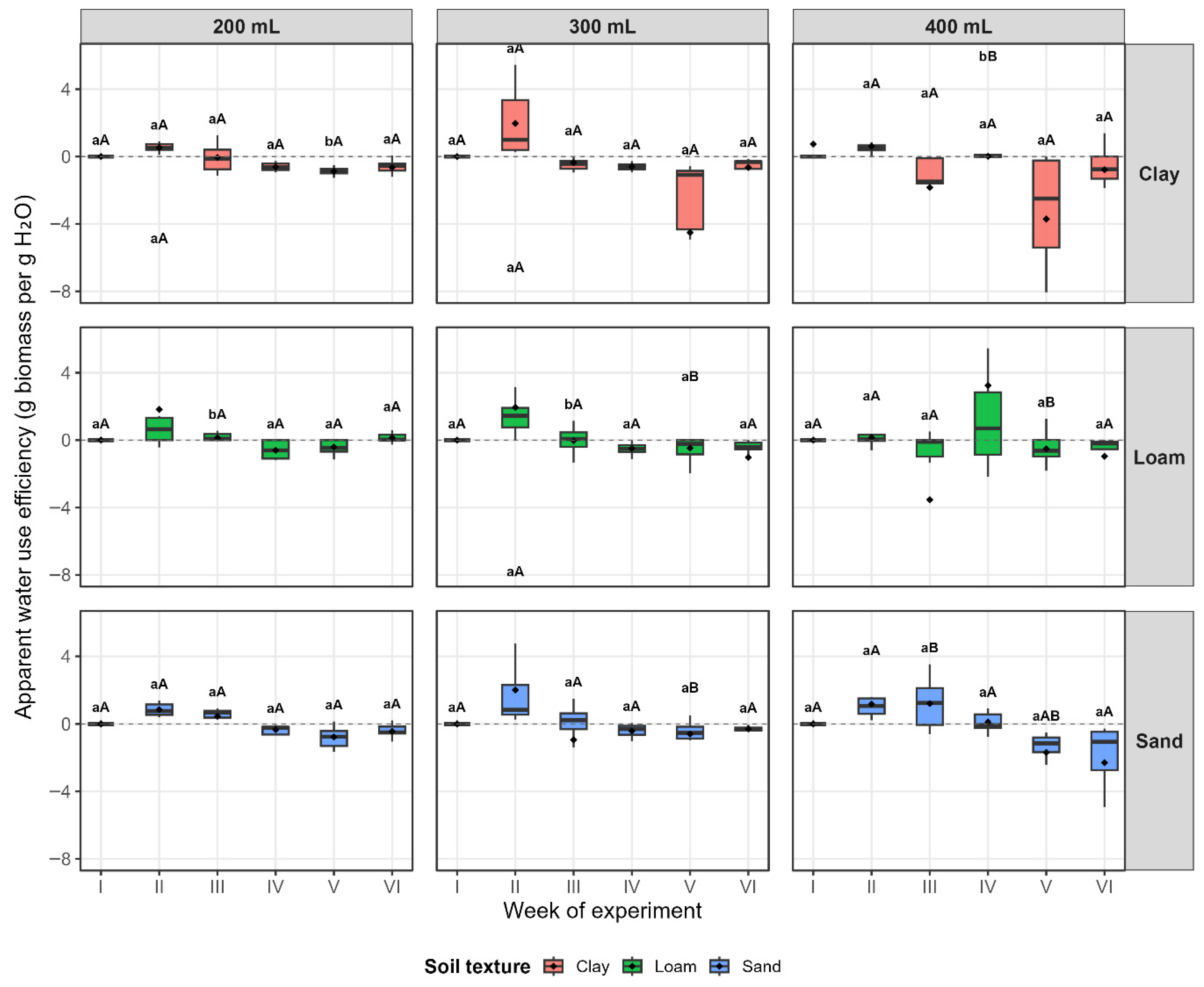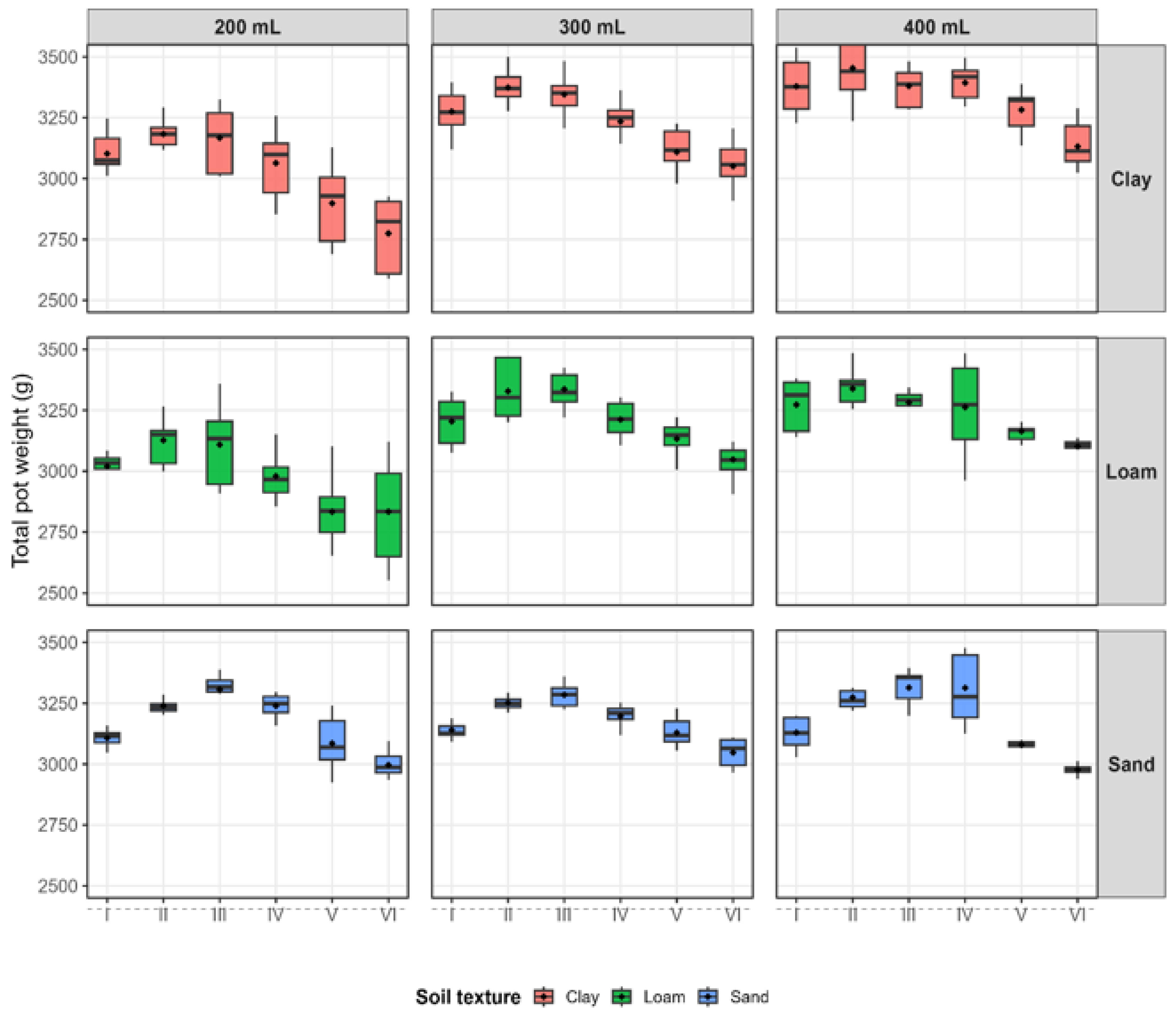 a across all treatments, with small positive responses under moderate irrigation (300 mL), reflecting rapid percolation and limited moisture availability for biomass gain. Pairwise comparisons (emmeans contrasts) confirmed significant differences among soil textures (Clay < Loam > Sand; all