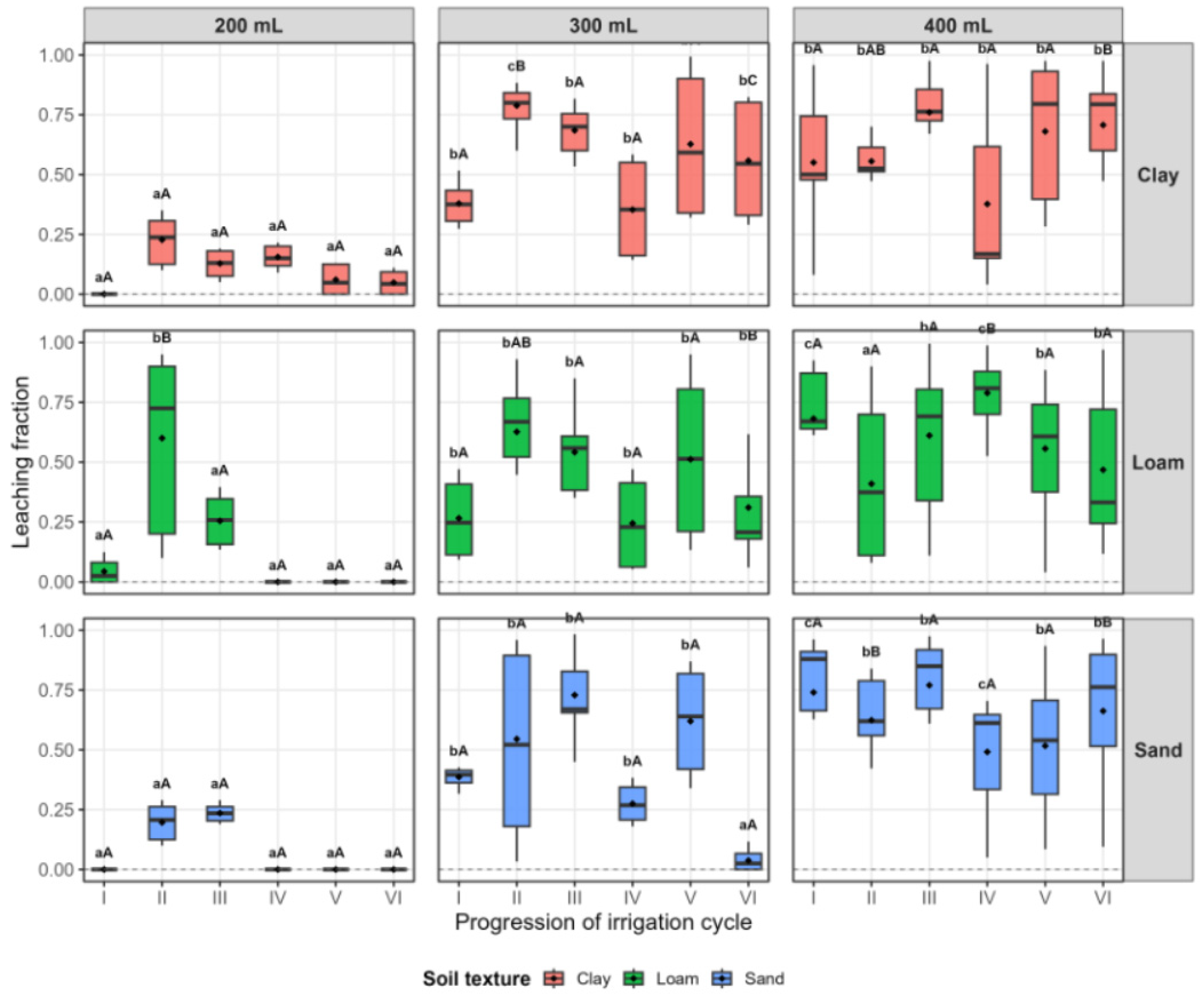 Loam soils consistently provided the most balanced conditions for plant growth and water regulation. They retained sufficient moisture while maintaining aeration, which translated into stable pot weights, moderate leaching losses, high WRI, and the highest WUEa and growth rates. Clay soils, though initially exhibiting high retention capacity, suffered from reduced aeration and excessive evaporative losses over time, leading to declining WUEa and growth in later stages. In contrast, sandy soils showed rapid drainage and low retention, resulting in limited but predictable responses that could be improved by more frequent or moderated irrigation.
