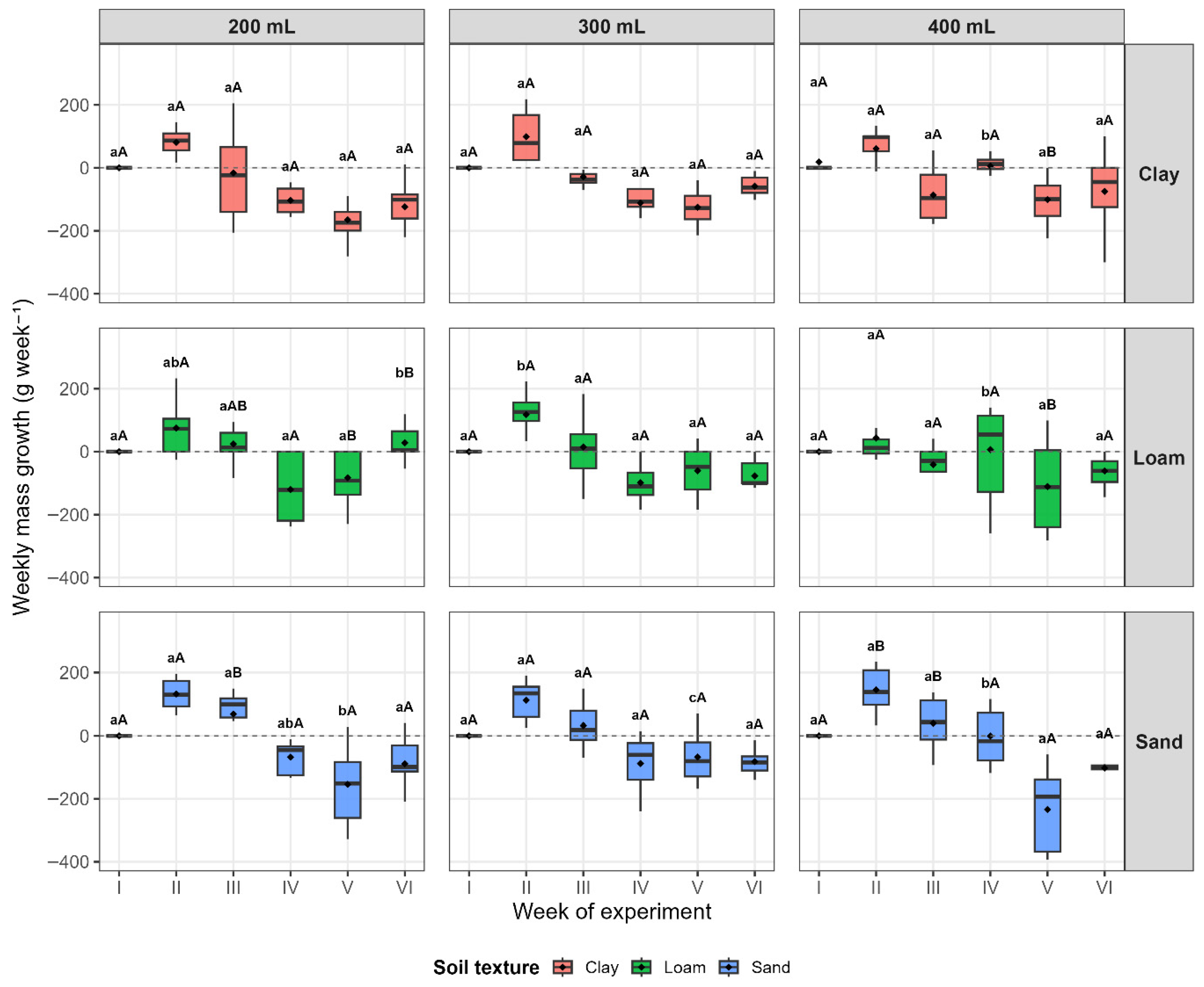 Weekly mass growth, representing the rate of biomass accumulation over successive measurement intervals, varied substantially across soil textures, irrigation volumes, and weeks (