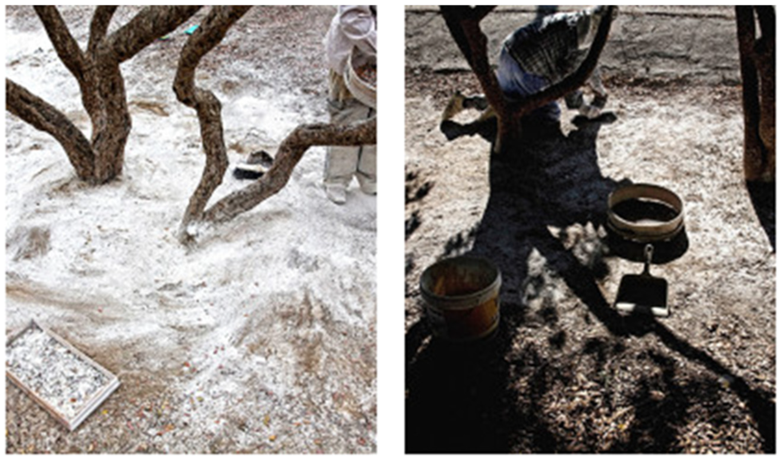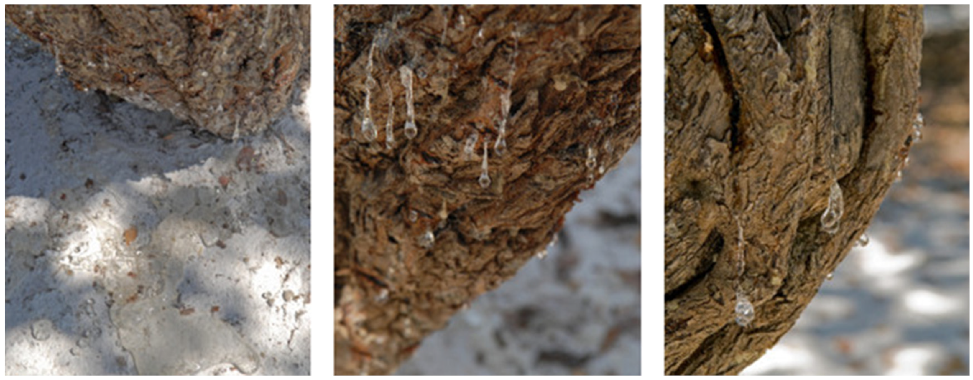 - Selective Breeding: Since ancient times, Chian farmers have identified trees with superior resin yields (Figure 3) and propagated them to establish new plantations, preserving the characteristics of the parent trees. Over centuries, this process of selective breeding has resulted in the highly productive mastic variety now botanically recognized as Pistacia lentiscus var. chia [4,11,15].