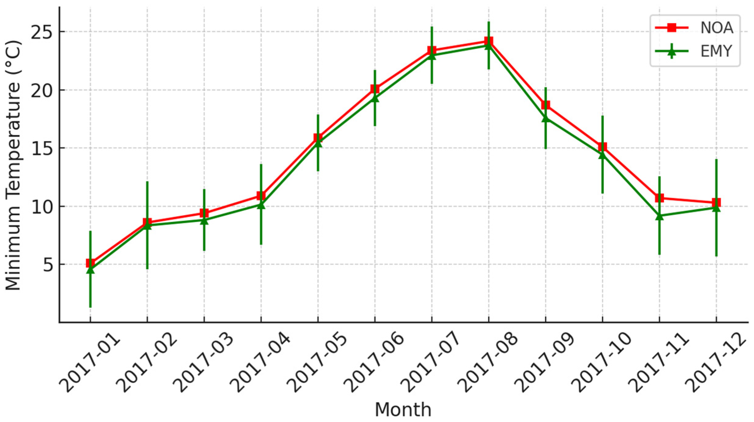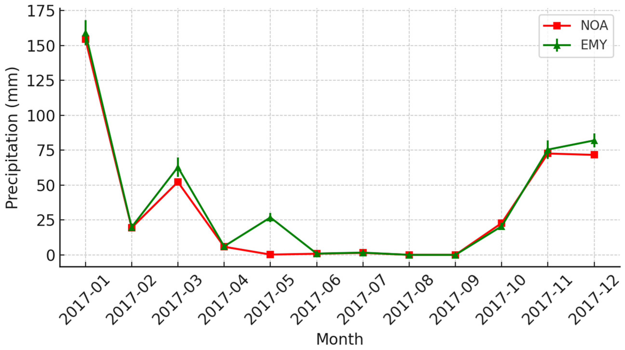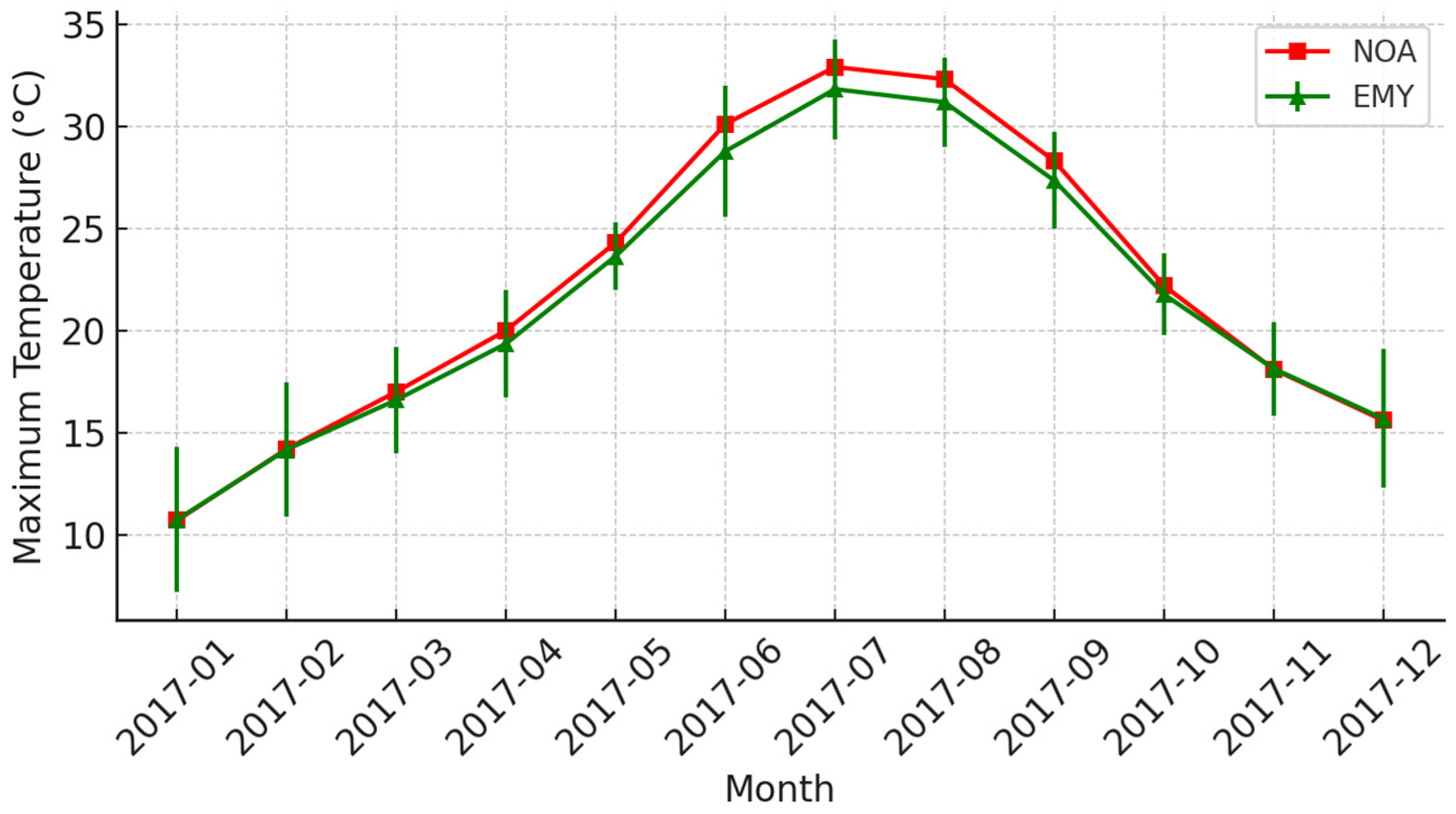 3.1. Comparison of HNMS (EMY) and NOA Measurements (2017)