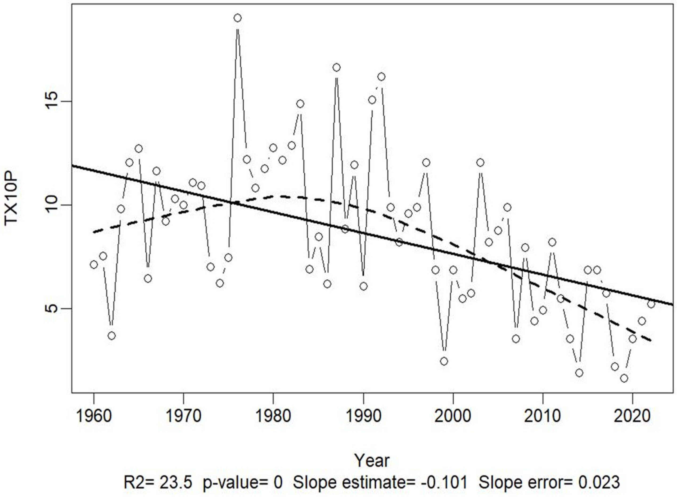 | TX10p | Cool Days—Days with Tmax < 10th percentile |