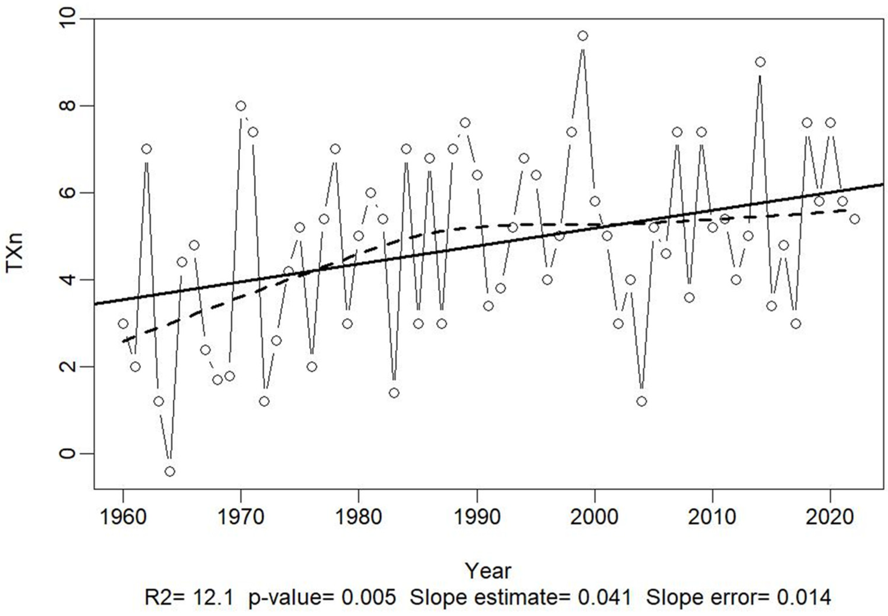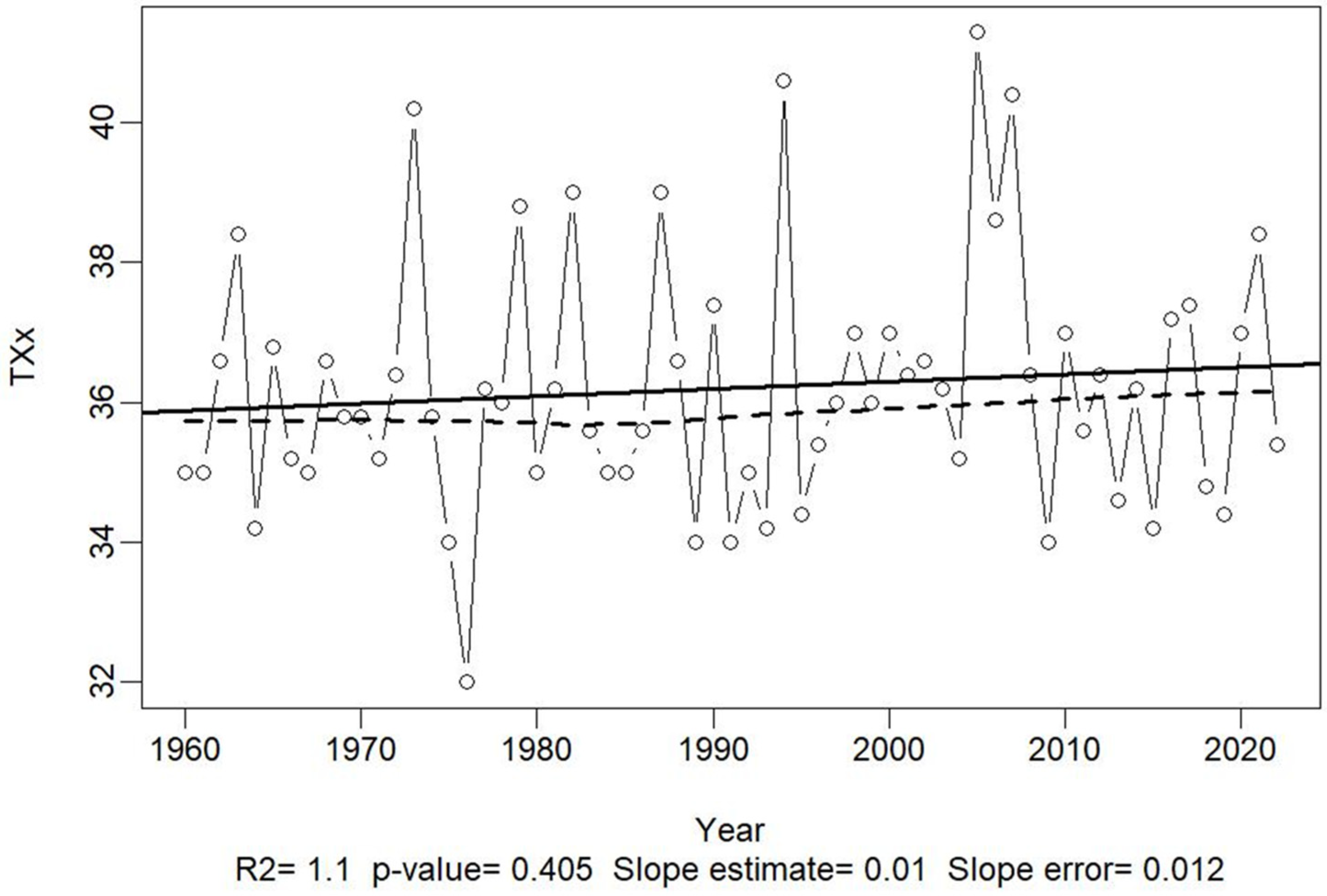 | TXx | Maximum of Tmax—Highest Tmax during the period |
